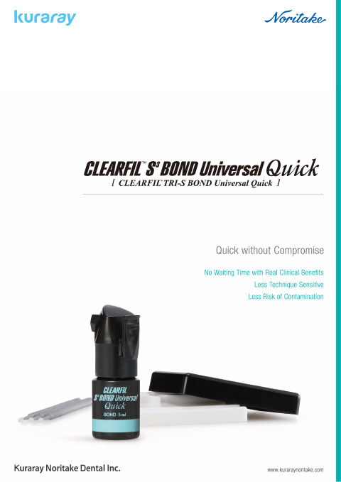 CLEARFIL™ TRI-S BOND Universal Quick là keo dán đa năng dạng chai đơn có thành phần hóa học gốc MDP & AMIDE mới, mang đến CÔNG NGHỆ LIÊN KẾT NHANH độc đáo. Monomer AMIDE mới này thẩm thấu nhanh vào ngà răng và men răng, giúp loại bỏ thời gian chờ đợi và giảm đáng kể sự hấp thụ nước. Nó cũng làm giảm độ nhạy kỹ thuật và thời gian bôi keo mà không ảnh hưởng đến độ bền liên kết, khả năng trám kín hoặc giảm độ nhạy. CLEARFIL™ TRI-S BOND Universal Quick có thể được trộn với CLEARFIL™ DC Activator để trở thành loại keo lưỡng trùng hợp, do đó sản phẩm này thực sự “Phổ biến” cho mọi nhu cầu etching và phục hình. *1
