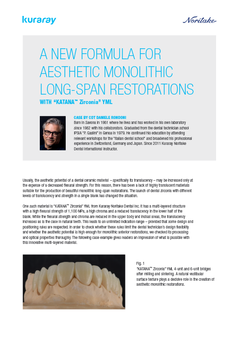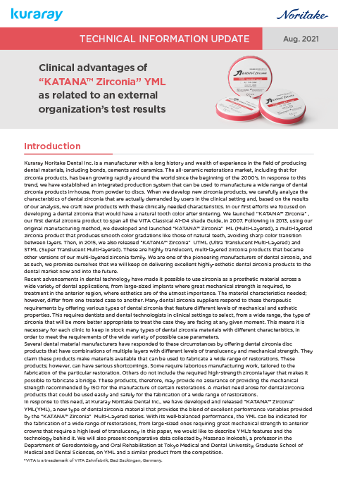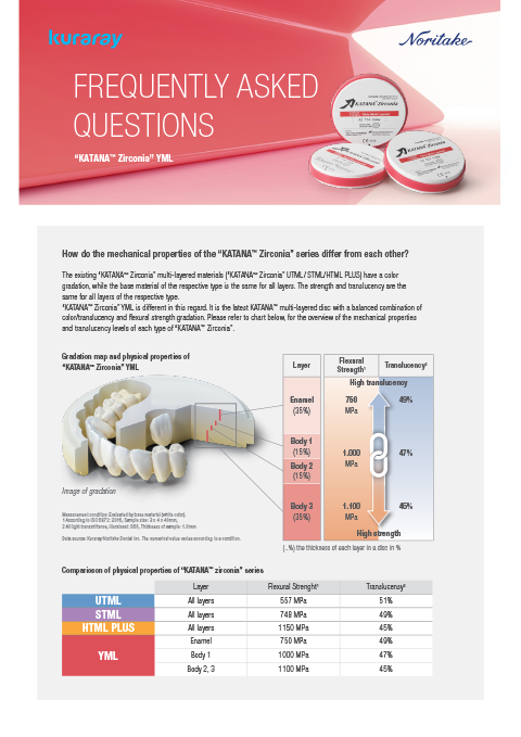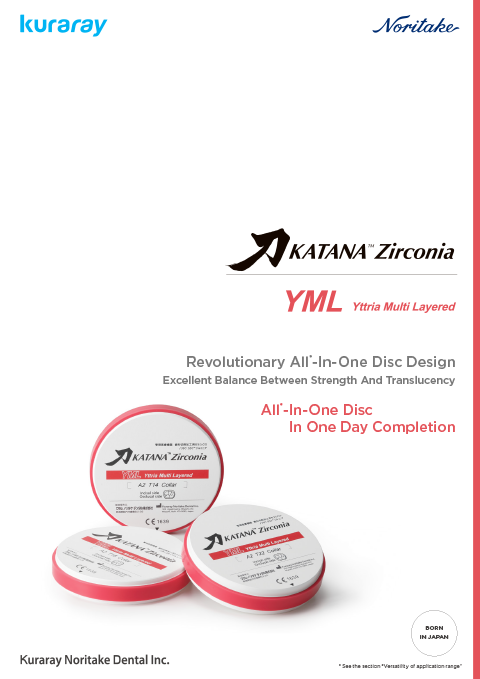 "KATANATM Zirconia" YML là định nghĩa mới về zirconia trong nha khoa. Sản phẩm này có đặc điểm là sự kết hợp nguyên liệu thô độc đáo giữa zirconia trong suốt có độ bền cao, được tích hợp với nhau bằng công nghệ sản xuất tiên tiến.